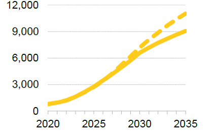 В долгосрочной перспективе фактором ростом спроса на продукцию Deye, конечно, станет развитие солнечной энергетики в Китае и в мире. BloombergNEF ожидает, что в 2025–2027 годах ввод солнечных мощностей будет держаться в диапазоне 698–780 ГВт против менее 600 ГВт в 2024 году. При этом на горизонте 2035 года BloombergNEF даже в базовом сценарии прогнозирует более чем утроение мощностей в сфере солнечной генерации, примерно до 9 000 ГВт.