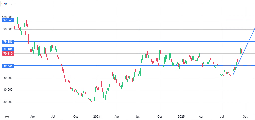 Расчет целевой цены подразумевает таргет RMB 90,7 на горизонте 12 мес. Это соответствует рейтингу «Покупать» и апсайду 29,4%.