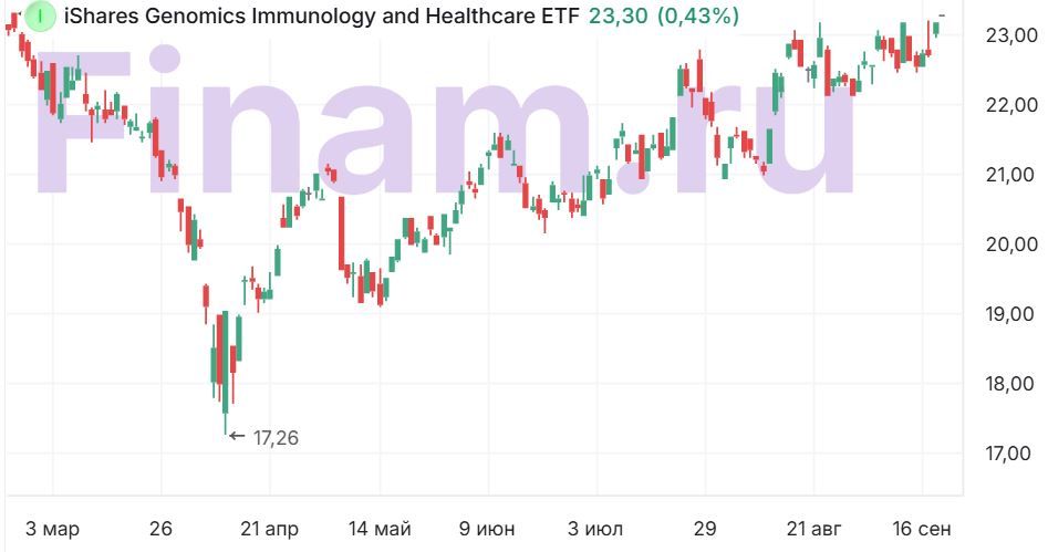 С апреля 2025 г. iShares Genomics Immunology and Healthcare ETF находится в фазе отскока и успела реализовать существенную часть потенциала роста на фоне того, что тема тарифов Трампа и его прочих гипотетических мер по регулированию ценообразования в отрасли по состоянию на конец III квартала по-прежнему не слишком осложняет жизнь игрокам биотеха, прогресс R&D продолжается вне зависимости от геополитики.