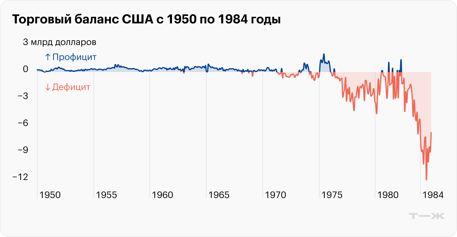 В 1980—1981 годах ключевая ставка в США составляла уже 20%. Это сделало долларовые активы более привлекательными для инвесторов, и спрос на них вырос. Всего в 1970—1985 годы доллар подорожал почти на 90% к основным мировым валютам. На этом фоне импорт стал более интересным, а экспорт — менее выгодным. Продукцию, которую ранее поставляли американские заводы, стали закупать в Японии, Германии и других странах. Это привело к заметному ухудшению торгового баланса страны.