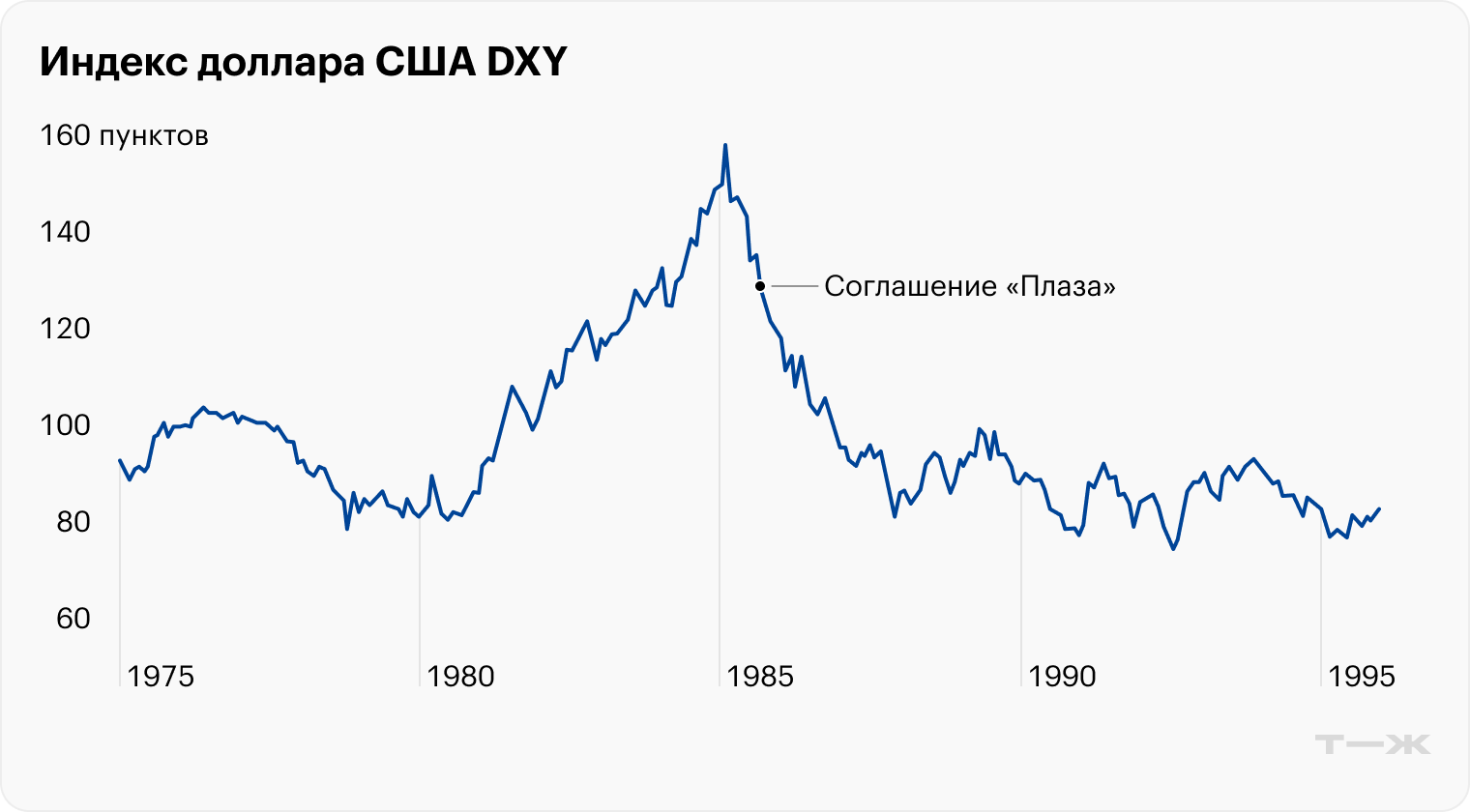 В итоге американские власти убедили своих ключевых партнеров предпринять ряд согласованных действий по регулированию валютных рынков. Их конечной целью было управляемое ослабление доллара. Ниже рассмотрим, какими мерами это сделали и к какому результату в итоге пришли. Но сначала разберемся в предпосылках «Плазы» — почему доллар стал дорогим.