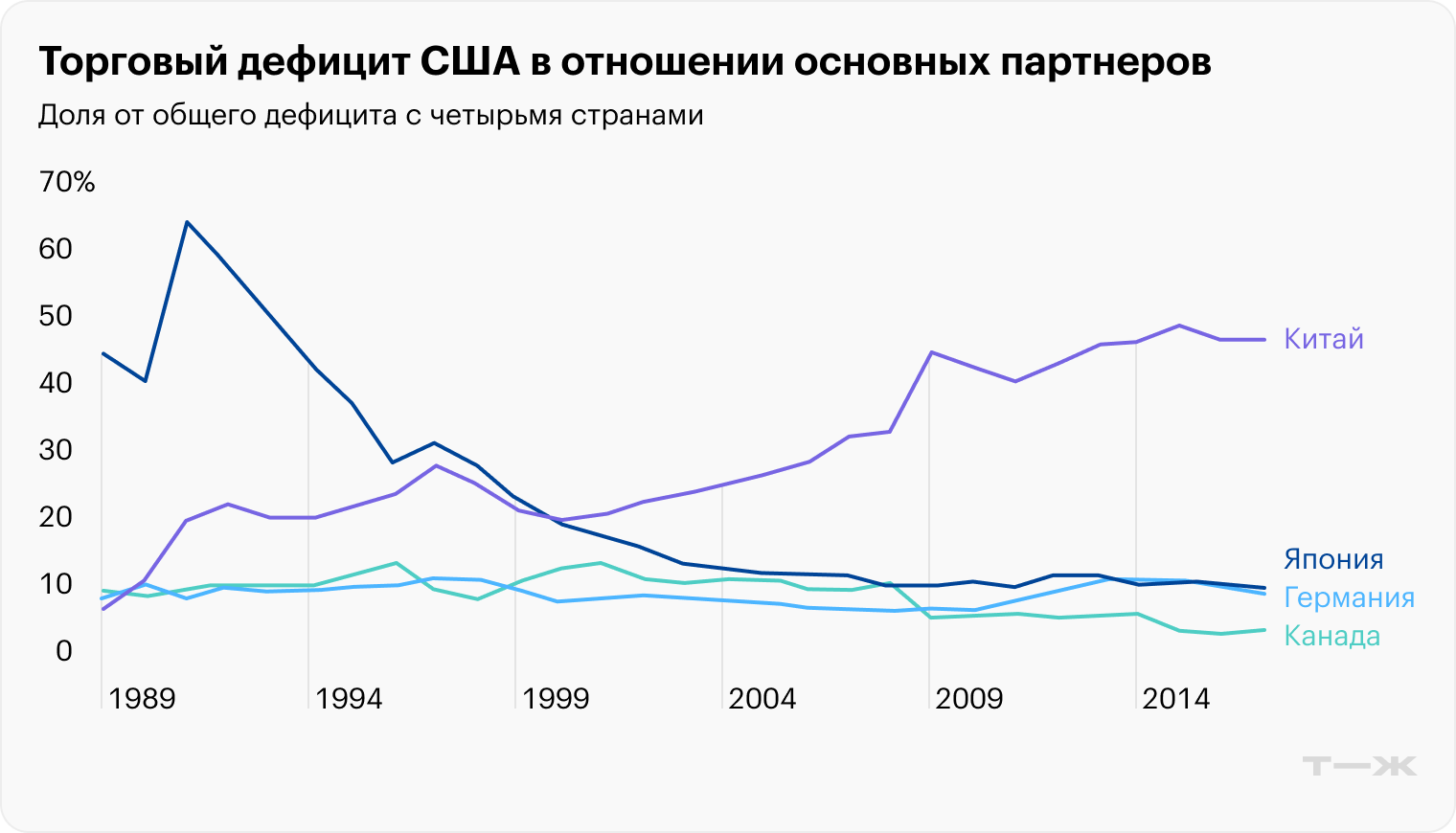 Но в долгосрочной перспективе это мало что изменило. Со второй половины 1990-х в мире вновь вырос спрос на доллар как защитный актив для инвесторов, а место некогда дешевых конкурентов США из Германии и Японии заняли развивающиеся страны, такие как Китай, Вьетнам и Мексика.