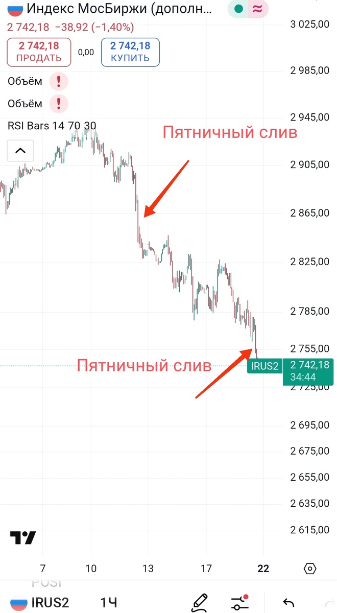 Однако главная проблема в том, что две пятницы как под копирку. Ближе к вечеру в конце недели рынок одинаково провалился две недели подряд. Такое возможно только при серьёзном объёме продаж.