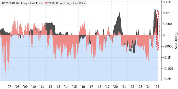 Однако на данный момент позиции как управляющих активами, так и хедж-фондов «близки к экстремальным, но еще не достигли их», отметил Родриго Катрил, стратег в National Australia Bank Ltd. в Сиднее. Это говорит в пользу «мнения, что эти позиции могут сохраняться еще некоторое время».