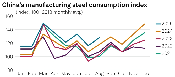 Индекс потребления стали в обрабатывающей промышленности Китая, рассчитываемый Platts, в августе составил 128 пунктов, что на 12 пунктов выше, чем в июле, и на 10 пунктов выше, чем в предыдущем году.