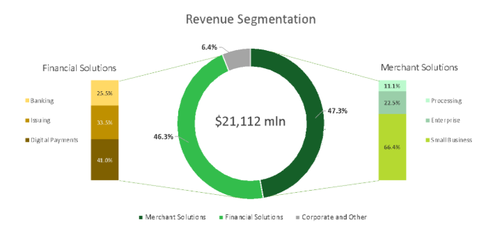 У Fiserv есть два ключевых направления для роста в сегменте приема платежей: система Clover для малого и среднего бизнеса (МСБ) и платформа Carat для крупных корпоративных клиентов. Почти половина выручки компании приходится на обслуживание торговых предприятий, поэтому ускорение в этой области это решающий фактор успеха. Диаграмма показывает долю этого сегмента в общей выручке за последние 12 месяцев и задает контекст для нашей идеи.