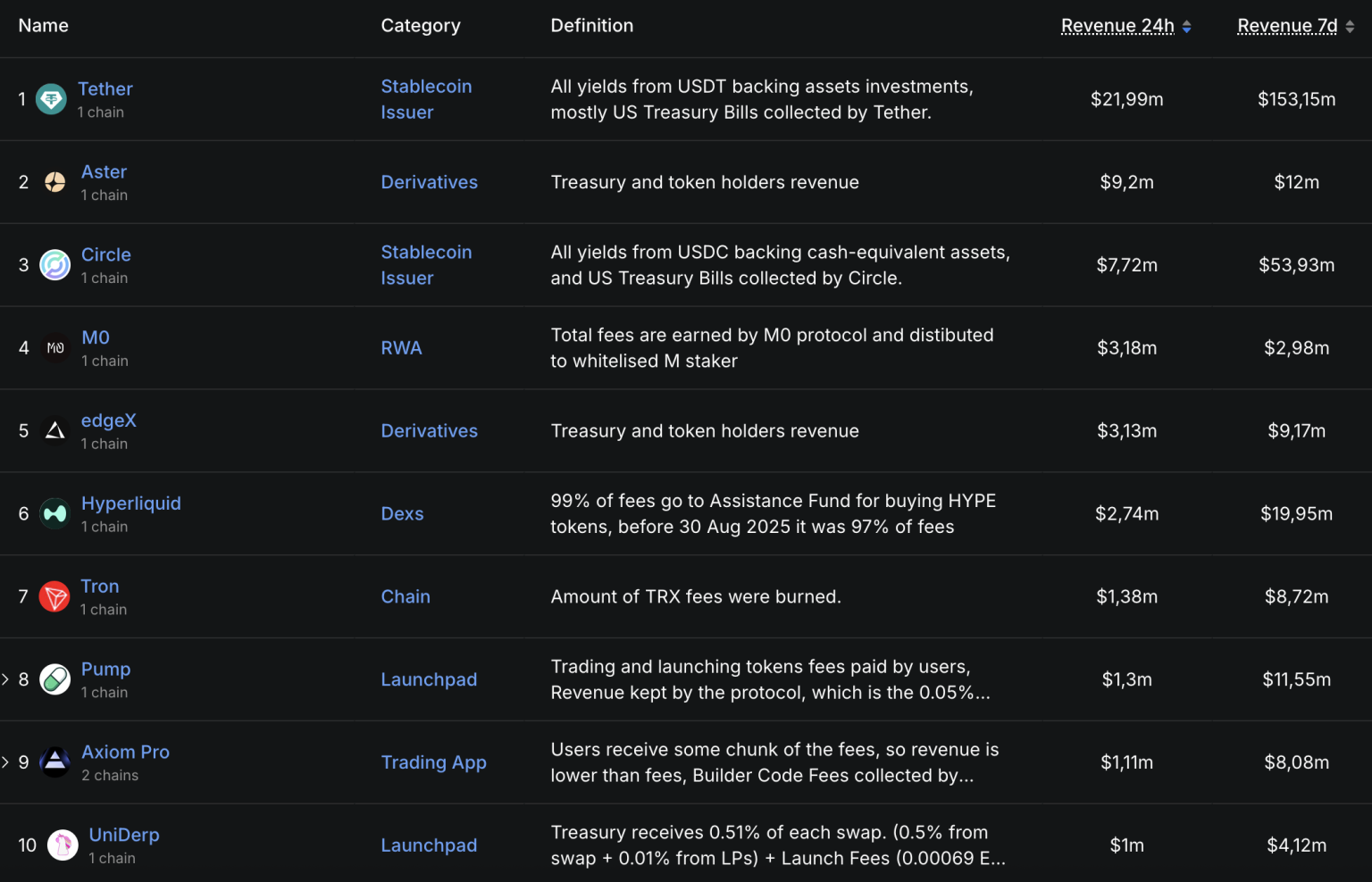 DEX на базе BNB Chain также превзошла площадку по генерации прибыли от комиссий: $9,2 млн против $2,7 млн за прошедшие сутки. Aster заняла второе место среди протоколов, также опередив стоящую за USDC компанию Circle.