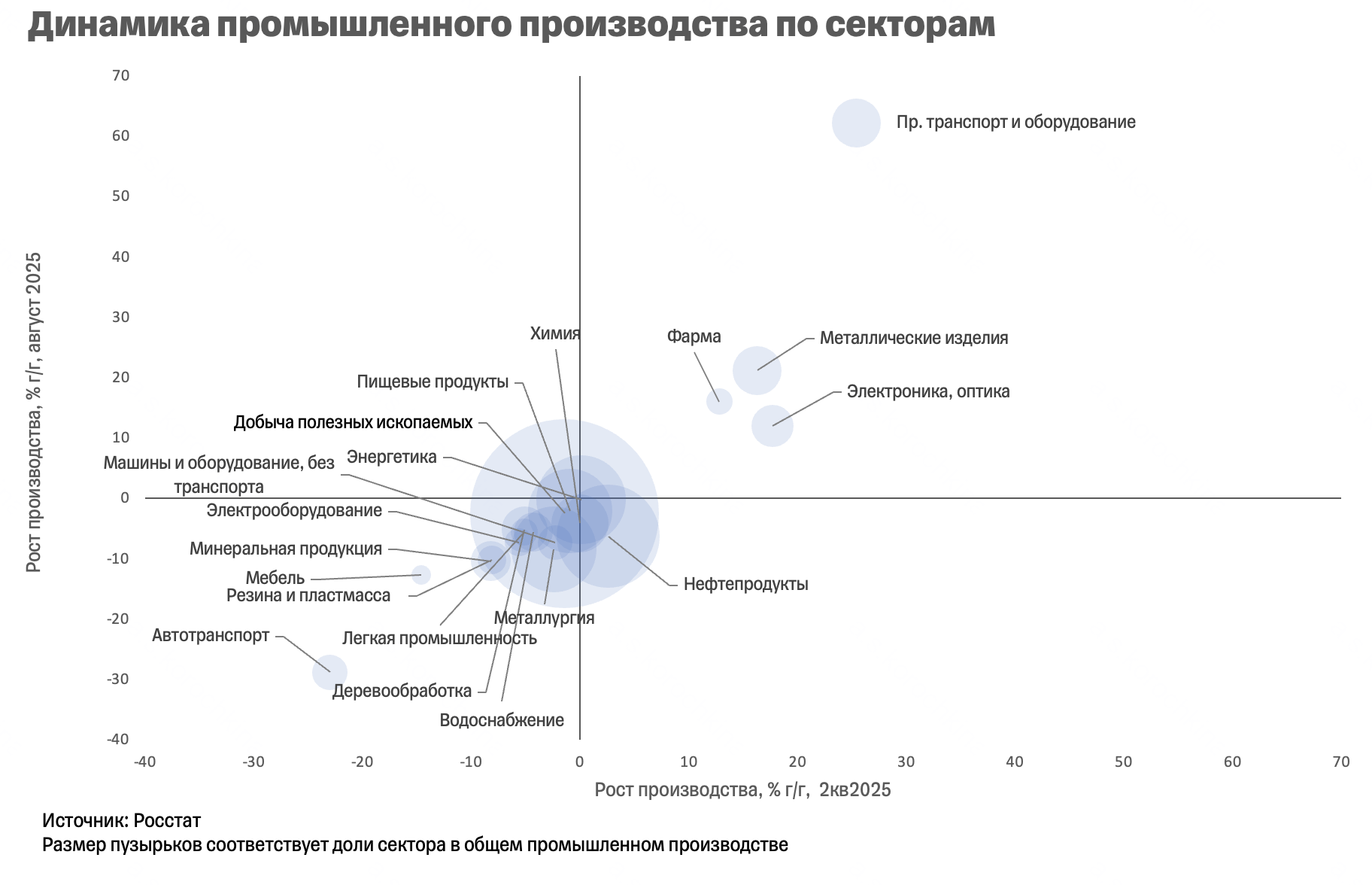Рост индекса промышленного производства в августе замедлился до 0,5% г/г после 0,7% г/г. Это слабее прогнозов рынка. Разрыв по секторам все больше, а отраслей в плюсе — все меньше. В лидерах роста по-прежнему госзаказ. Ожидаемо ухудшилась динамика в добыче и производстве нефтепродуктов.