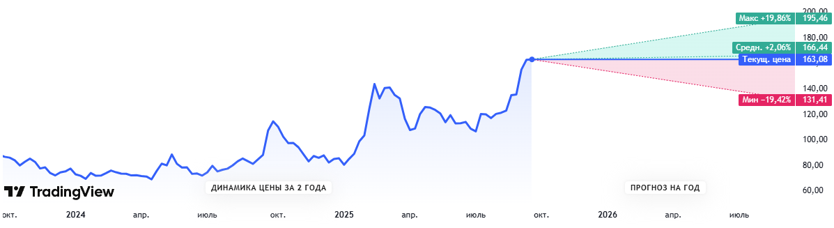 Консенсус-прогноз на ближайший год предполагает рост стоимости акций BABA на 19,86% — до $195,46 за бумагу (+3200 пунктов):