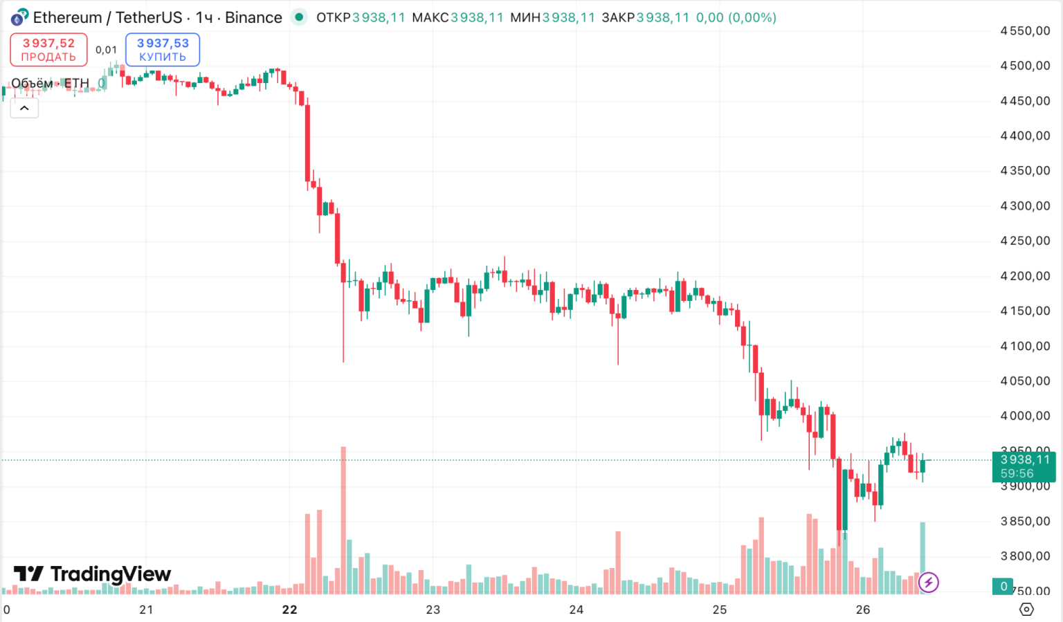 Цена Ethereum просела ниже $4000 впервые с начала августа. Минимальной отметкой за прошедшие 24 часа был уровень $3833.