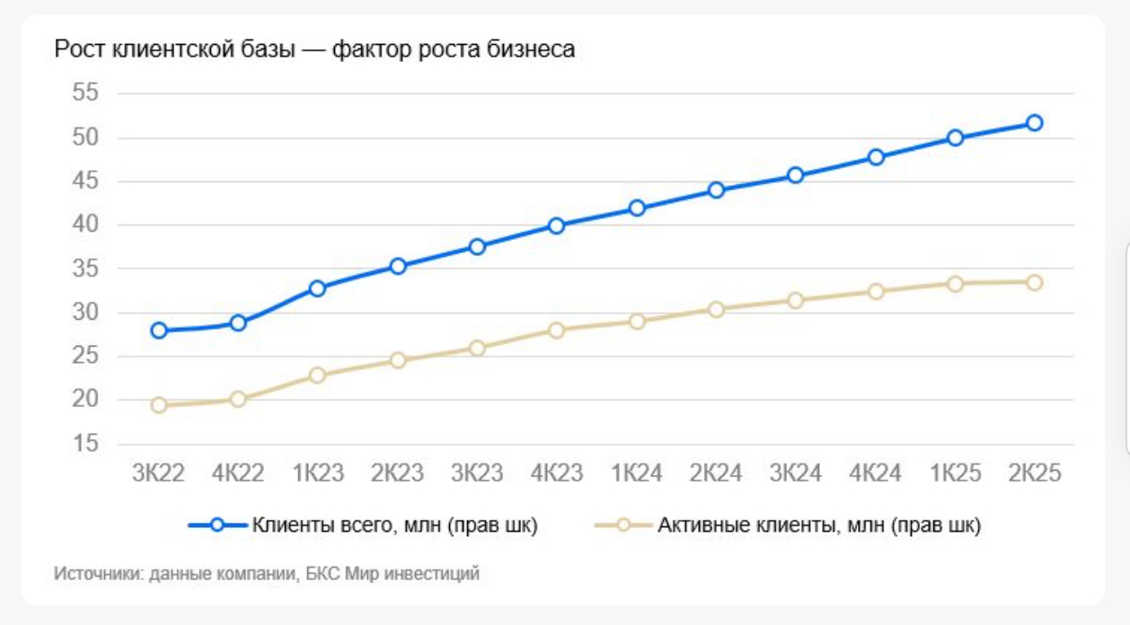 Ведущий финтех-игрок в рознице, рост сохраняется. Мы отмечаем продолжающийся рост клиентской базы — по итогам июля она составила 51,8 млн человек, рост на 16% год у году. Несмотря на то, что данные темпы роста ниже исторических уровней, тем не менее мы рассматриваем их как сильные с учетом достаточно высокой базы. Мы отмечаем, что 30% выручки приходится на бизнесы, не связанные с кредитованием.