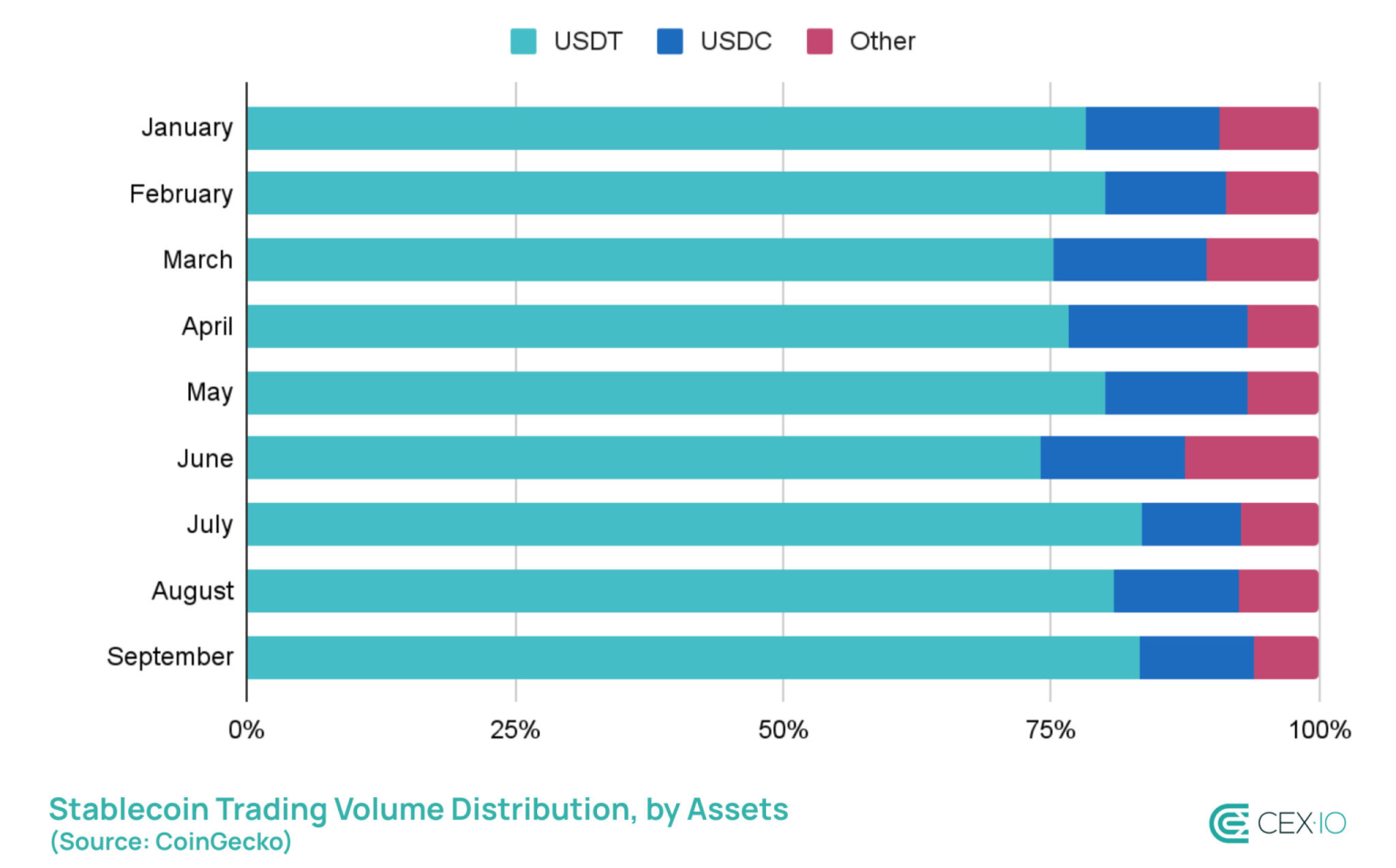 USDT удалось укрепить доминирование по объему торгов. Его доля в квартальном выражении выросла с 77,2% до 82,5%, в то время как у USDC снизилась с 14,5% до 10,5% . Другие монеты тоже потеряли позиции.