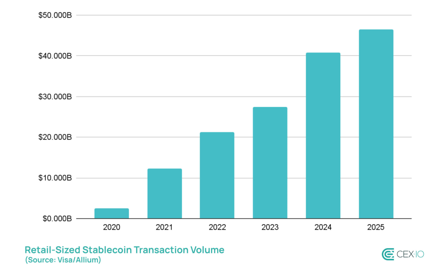 Среди органический переводов наиболее сильно выделился ритейл (транзакции на сумму менее $250). Показатель достиг нового исторического максимума, что помогло 2025 году стать «самым активным годом в истории розничного использования стейблкоинов».