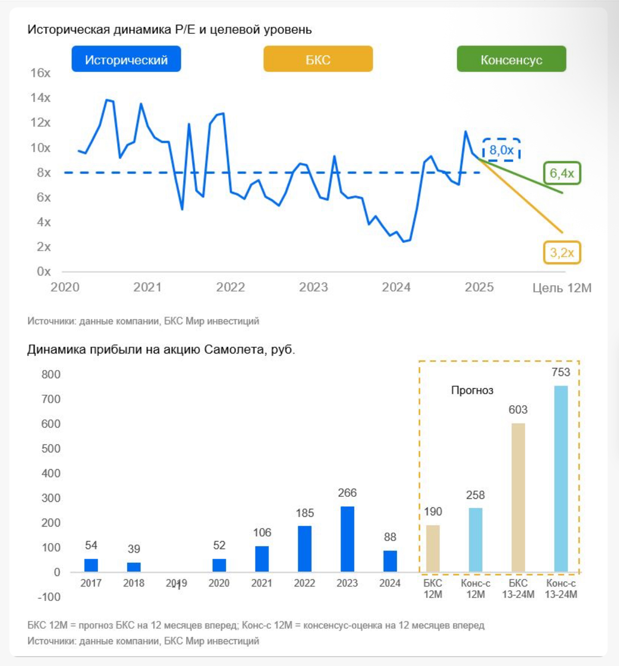 Ожидаем улучшения операционной рентабельности, но большего давления на прибыль из-за процентных расходов. Мы обновили наш прогноз на 2025 г. с учетом финансовых результатов за I полугодие. Самолет активно оптимизирует расходы, что привело к существенному улучшению валовой маржинальности в I полугодии. Однако процентные расходы значительно превысили наши ожидания, поэтому мы снижаем прогноз по прибыли и ждем убытка во II полугодии 2025 г. Мы ждем положительный финансовый результат по итогам 2026 г.