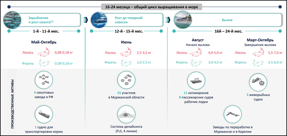 Первые 11 месяцев производится выращивание смолта (мальков). Далее 4 месяца рыба набирает товарный вес. С 16ого по 24ый месяц производится вылов и отправка на заводы по переработке.
