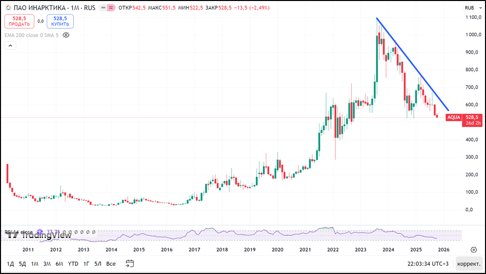Уже два года как идёт падение в акциях Инарктики. Котировки с максимумов упали почти в 2 раза. С начала года динамика -12%.