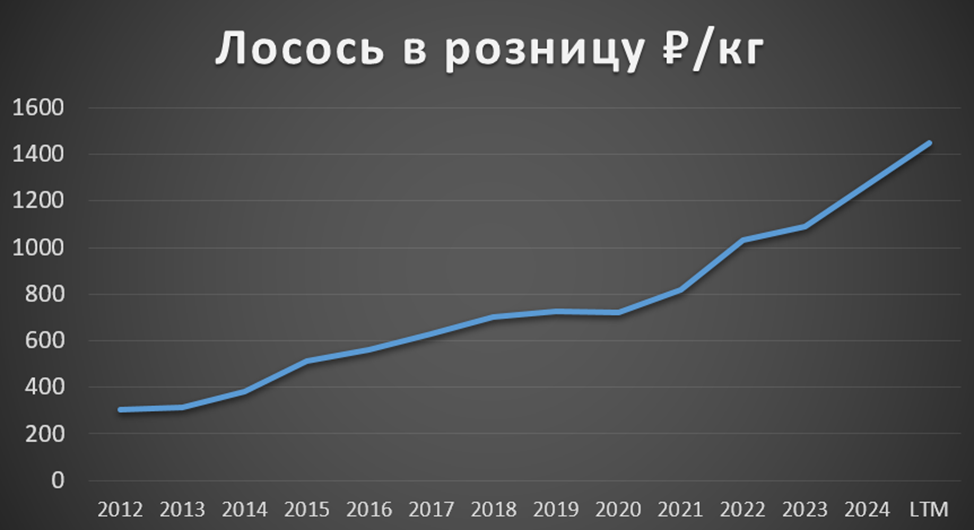Цены в розницу на лосося в РФ постоянно растут. Обычно из-за девальвации рубля, т.к. здесь высокая доля импорта. Но последние годы усилился фактор инфляции, а также снижение объемов предложения.