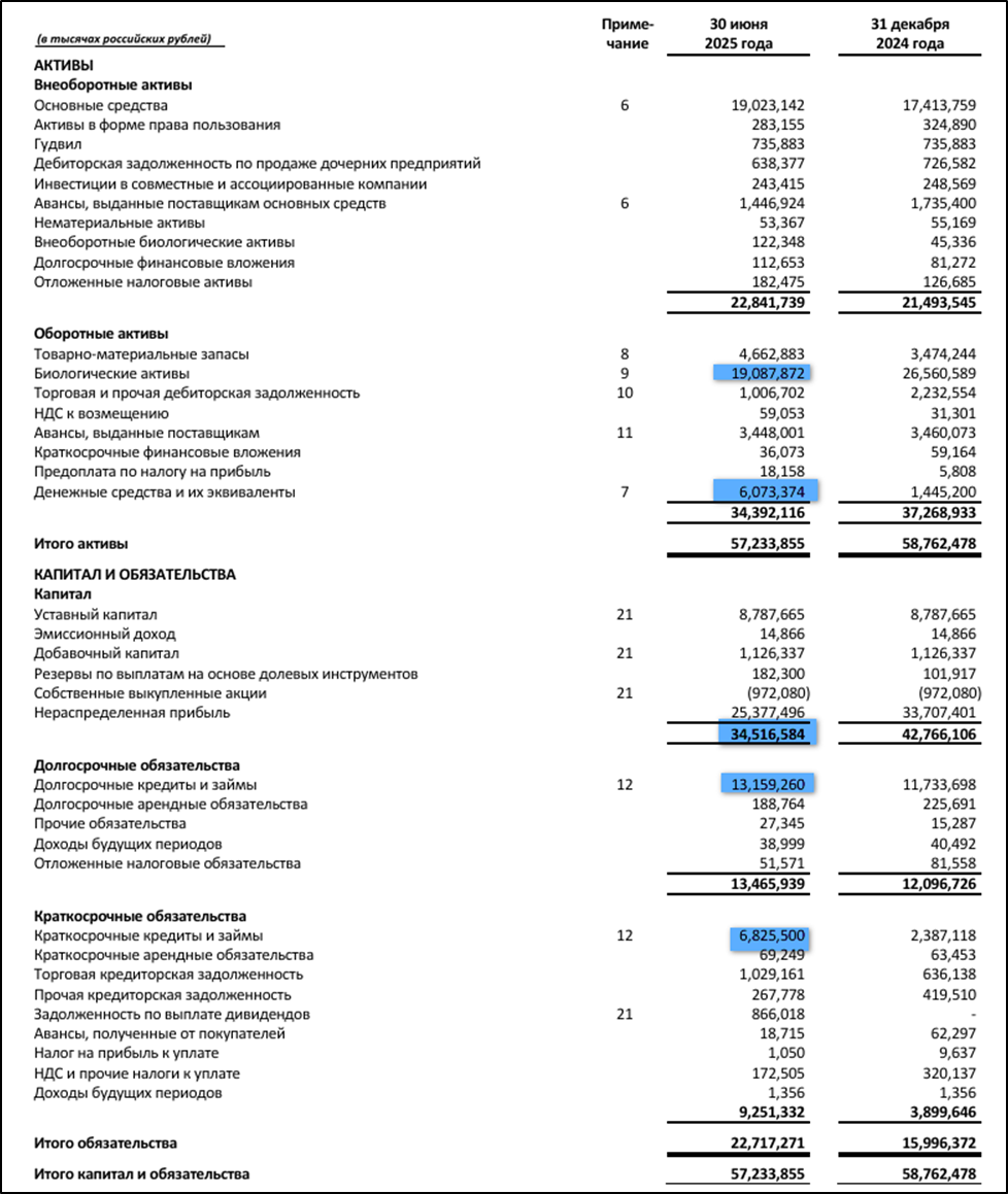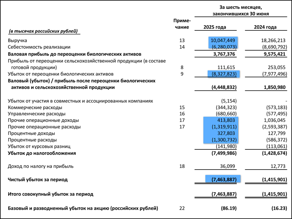 Выручка снизилась в 1,8 раз г/г до 10 млрд из-за падения объемов продаж. Себестоимость снизилась меньшими темпами. Также компания снова отразила огромный бумажный убыток от переоценки биологических активов, он был сформирован в основном за счет снижения доли товарной рыбы на конец отчетного периода. Еще в строке «Прочие операционные расходы» отражена потеря биологических активов на 1,2 млрд. Также вследствие роста долга и процентных ставок, в 2 раза г/г выросли чистые процентные расходы. В итоге, чистый убыток вырос более чем в 5 раз и составил 7,5 млрд. Но если не учитывать бумажные переоценки биологических активов, то ЧП скорр = 0,8 млрд, но и это падение почти в 8 раз г/г.