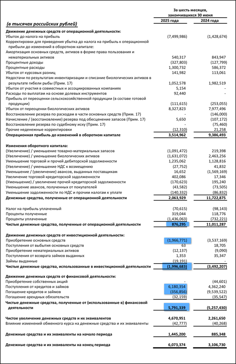 Из-за массовой гибели рыбы в 2024 году, продажи 1П 2025 упали в 2 раза г/г. Поэтому, несмотря на неплохие цены на лосось, финансовые результаты очень слабые. Компания отразила большой убыток, свободный денежный поток отрицательный. Долговая нагрузка средняя.