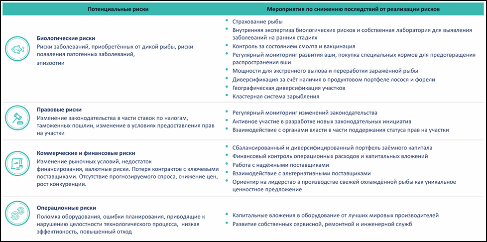У компании несколько потенциальных рисков. Среди них выделяются биологические риски, связанные с возможным заболеванием рыб. Как мы видели выше, он был в полной мере реализован в прошлом году.