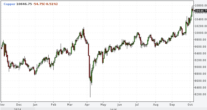 В понедельник, 6 октября, фьючерсы на медь на Лондонской бирже упали на 0,7% до 10 643 доллара за тонну, но выросли более чем на 7% за месяц и на 21,4% с начала 2025 года.