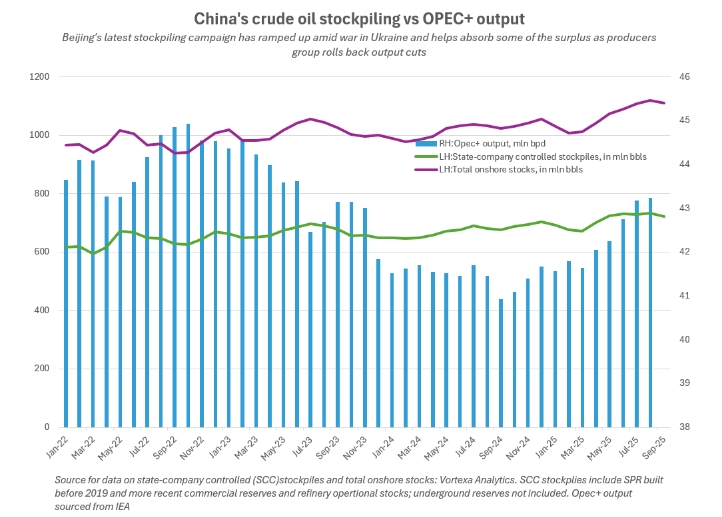 Китай также известен своей гибкостью в управлении запасами. Он увеличивает импорт нефти, когда цены кажутся разумными, и сокращает его при росте цен. Например, в сентябре импорт снизился до 10,83 миллиона баррелей в сутки с 11,66 миллиона в августе, по данным LSEG Oil Research. Сентябрь стал самым слабым месяцем с февраля, а падение импорта произошло после скачка цен на нефть в июне, когда стоимость Brent достигла 81,40 доллара за баррель на фоне конфликта Израиля и Ирана. Большинство поставок в сентябре были организованы в период высоких цен, и китайские нефтеперерабатывающие заводы, вероятно, решили сократить импорт в ожидании снижения цен.
