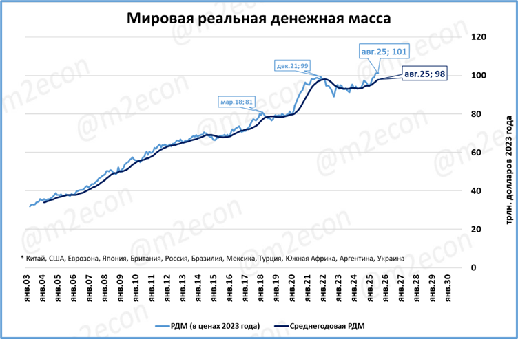 В постоянных ценах 2023 года мировая РДМ со 101,2 трлн долларов в июле выросла до 101,3 трлн в августе. Это новый исторический рекорд.