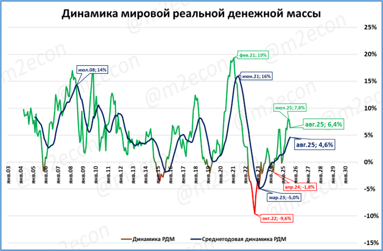 Мировая денежная масса в реальном выражении растёт уже больше года, рост ускоряется.