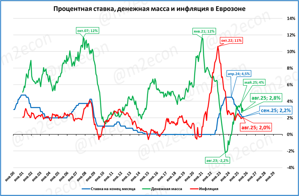 В августе рост денежной массы Еврозоны составил 2,8% к аналогичному периоду 2024 года.