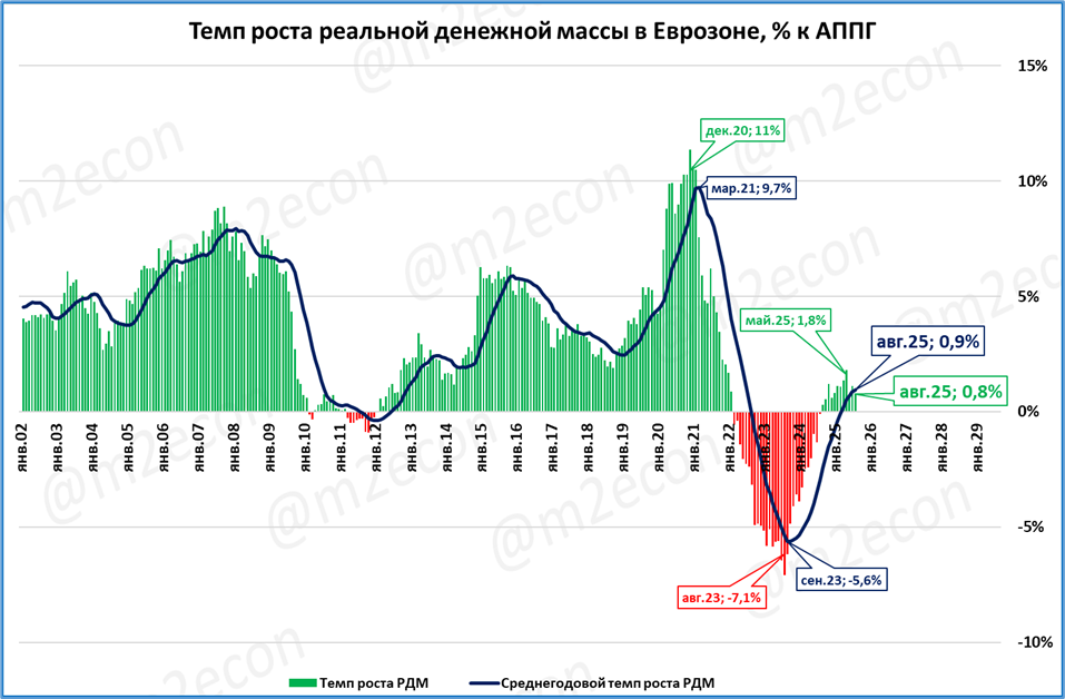 Учитывая долгое падение реальной денежной массы в 2022-2024 годах, а также невысокие темпы роста РДМ в настоящем, мы ускорения экономики Еврозоны не ожидаем, даже такого слабого. Рост экономики Еврозоны, по нашей оценке, останется слабым и даже может замедлиться.