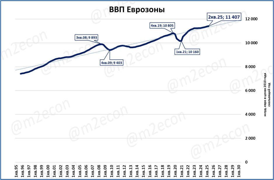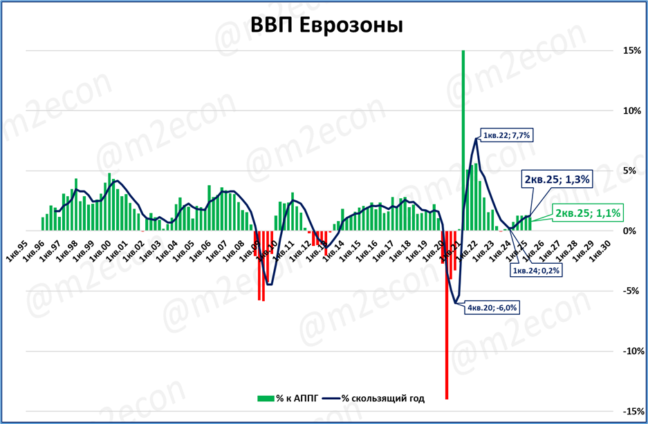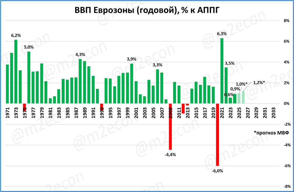 С одной стороны, это менее 1% в год (учитывая сложный процент). С другой стороны, Еврозона и до 2020 года темпами роста особо не блистала. Простое среднее темпов роста с 1995 по 2019 год составляет 1,6%.