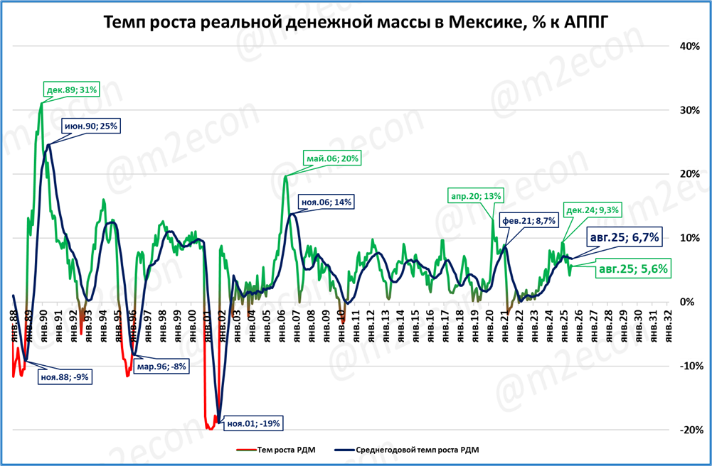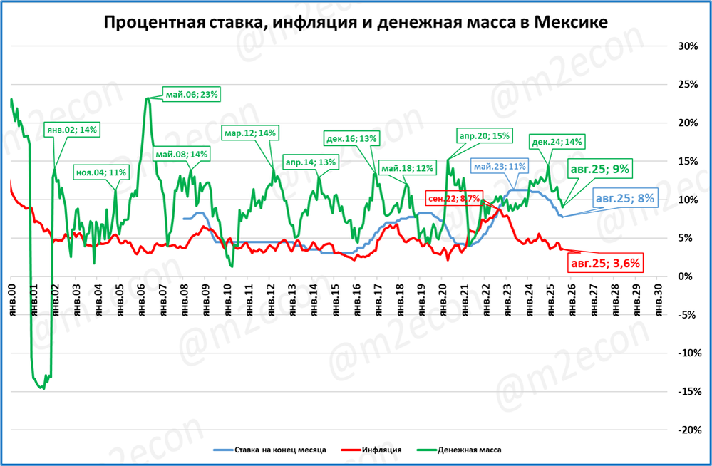 В августе рост реальной денежной массы Мексики составил 5,6% к аналогичному периоду 2024 года. Рост ВВП во 2 квартале замедлился до 0,1% ко 2 кварталу прошлого года.
