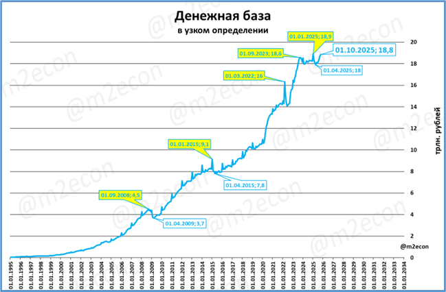 Номинально узкая денежная база (УДБ) на 1 октября составила 18,8 трлн рублей и показывает второе лучшее за всю историю значение.
