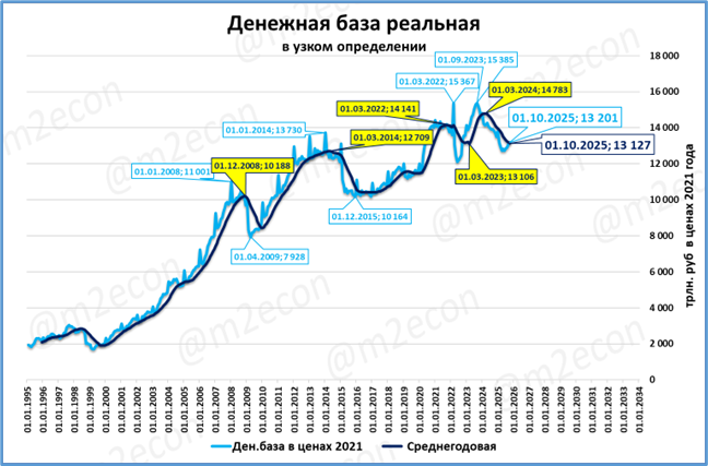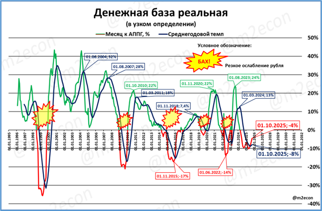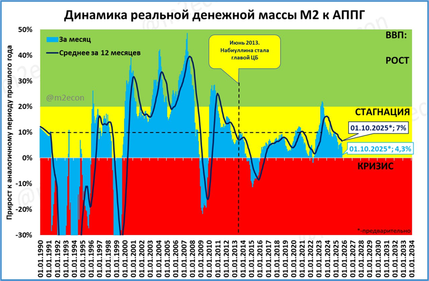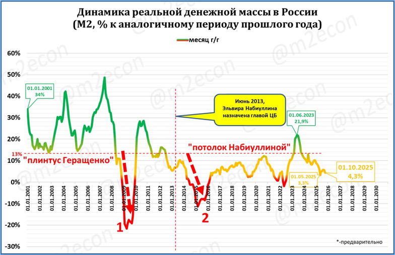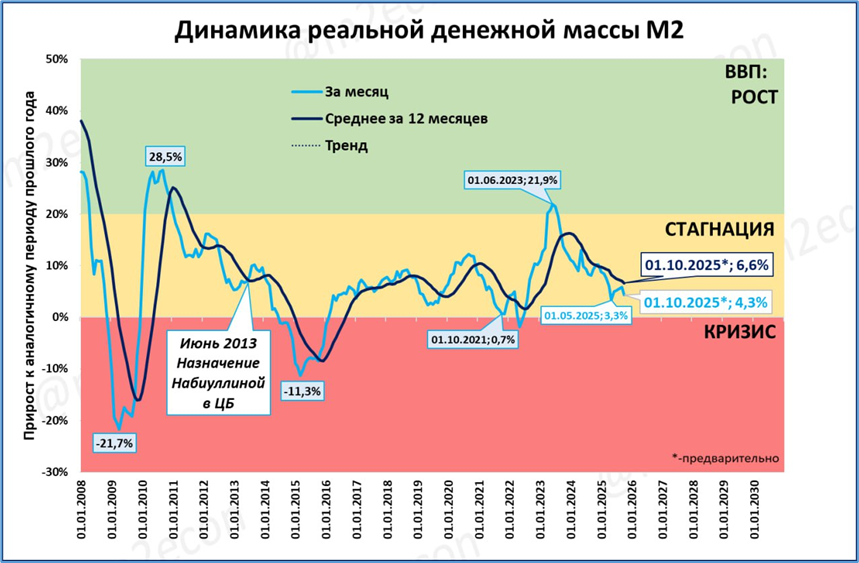 Рост реальной денежной массы М2 с 22% в июне 2023 замедлился до 4% по итогам сентября 2025. Экономика отвечает на этот денежный зажим замедлением.