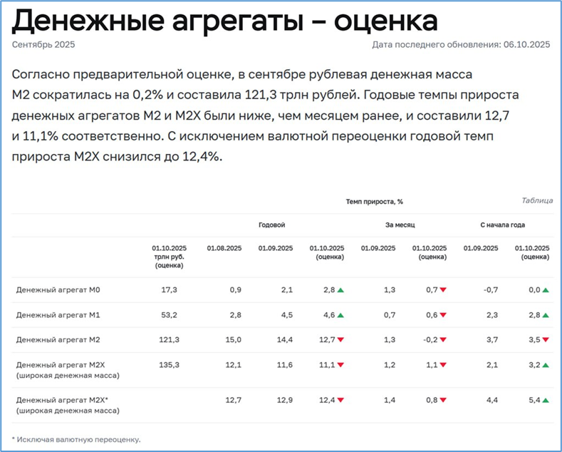ЦБ опубликовал оценку денежных агрегатов на 1 октября. Рост денежных агрегатов М2 и М2Х замедляется. Агрегаты М0 и М1 растут медленнее инфляции (= падают в реальном выражении).