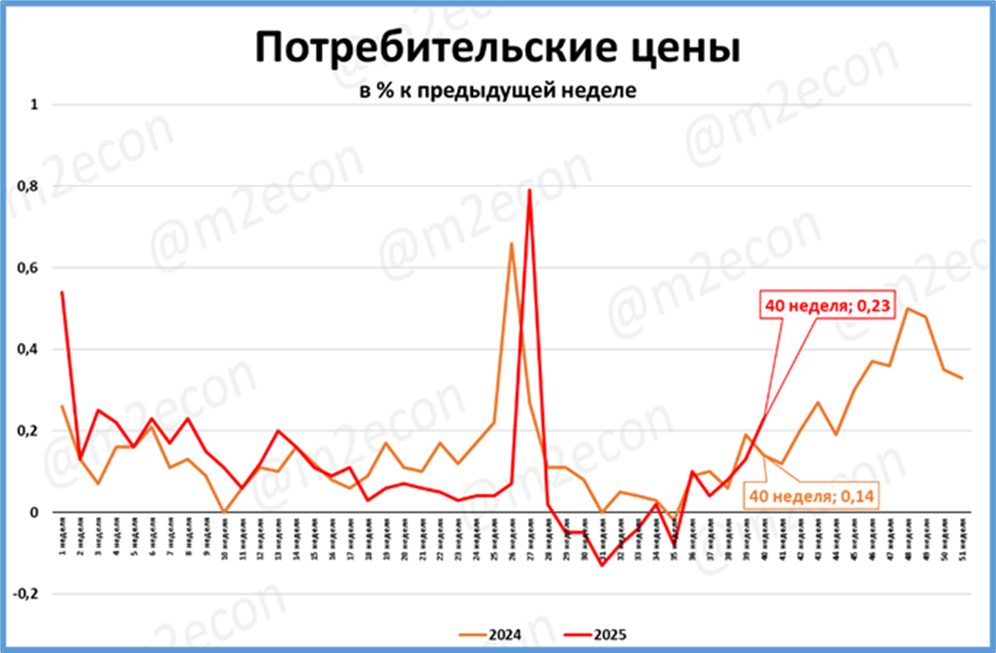 За 40 неделю цены выросли на 0,23%. Это выше, чем за 40 неделю прошлого года (0,14%).