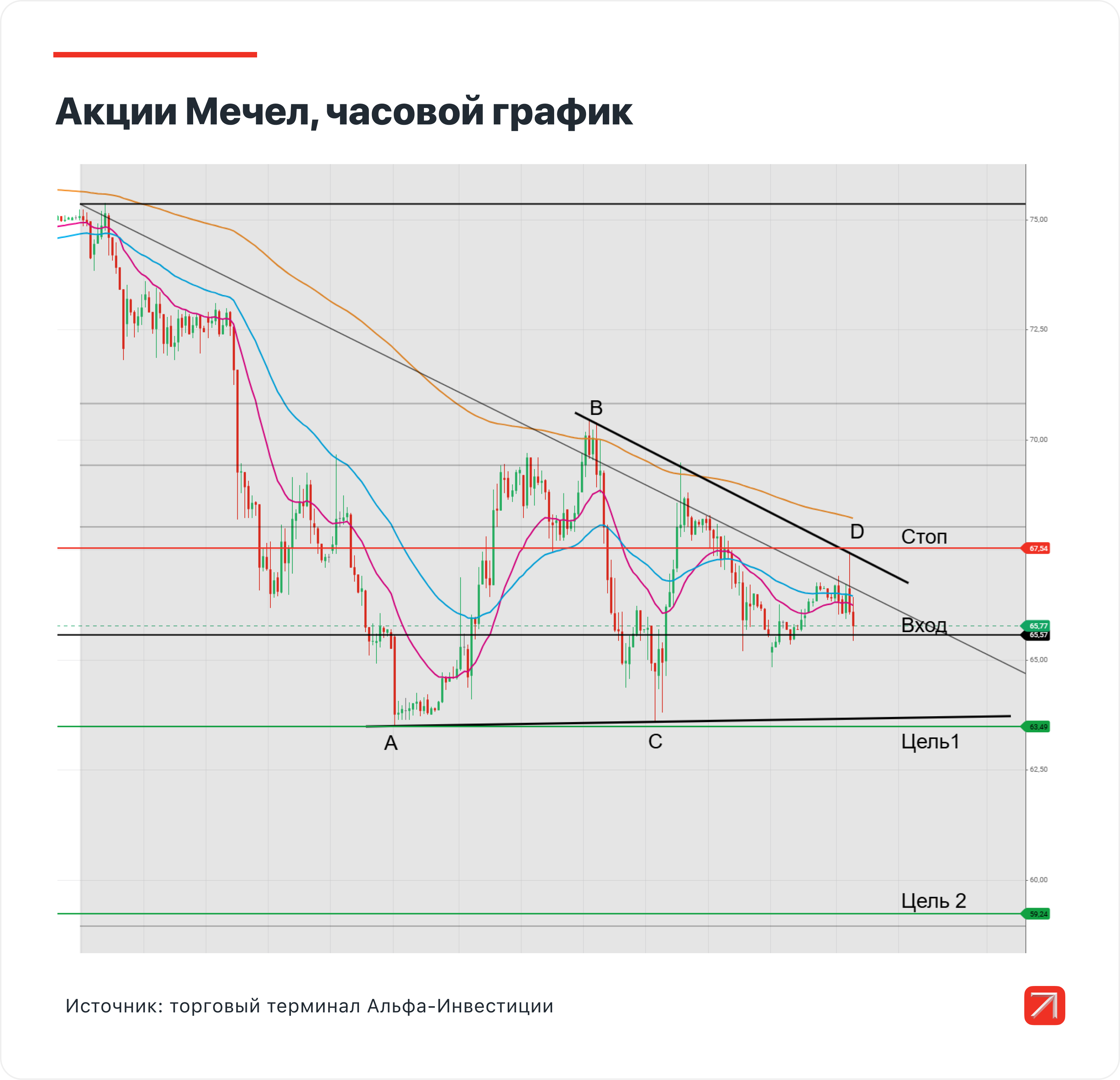 Стоп-заявку изначально можно установить на уровне 67,54 руб. Ориентируемся на расположение уровня точки D. Если бумага уйдёт выше него, то это с высокой долей вероятности приведёт к слому технического паттерна и отказу от идеи.