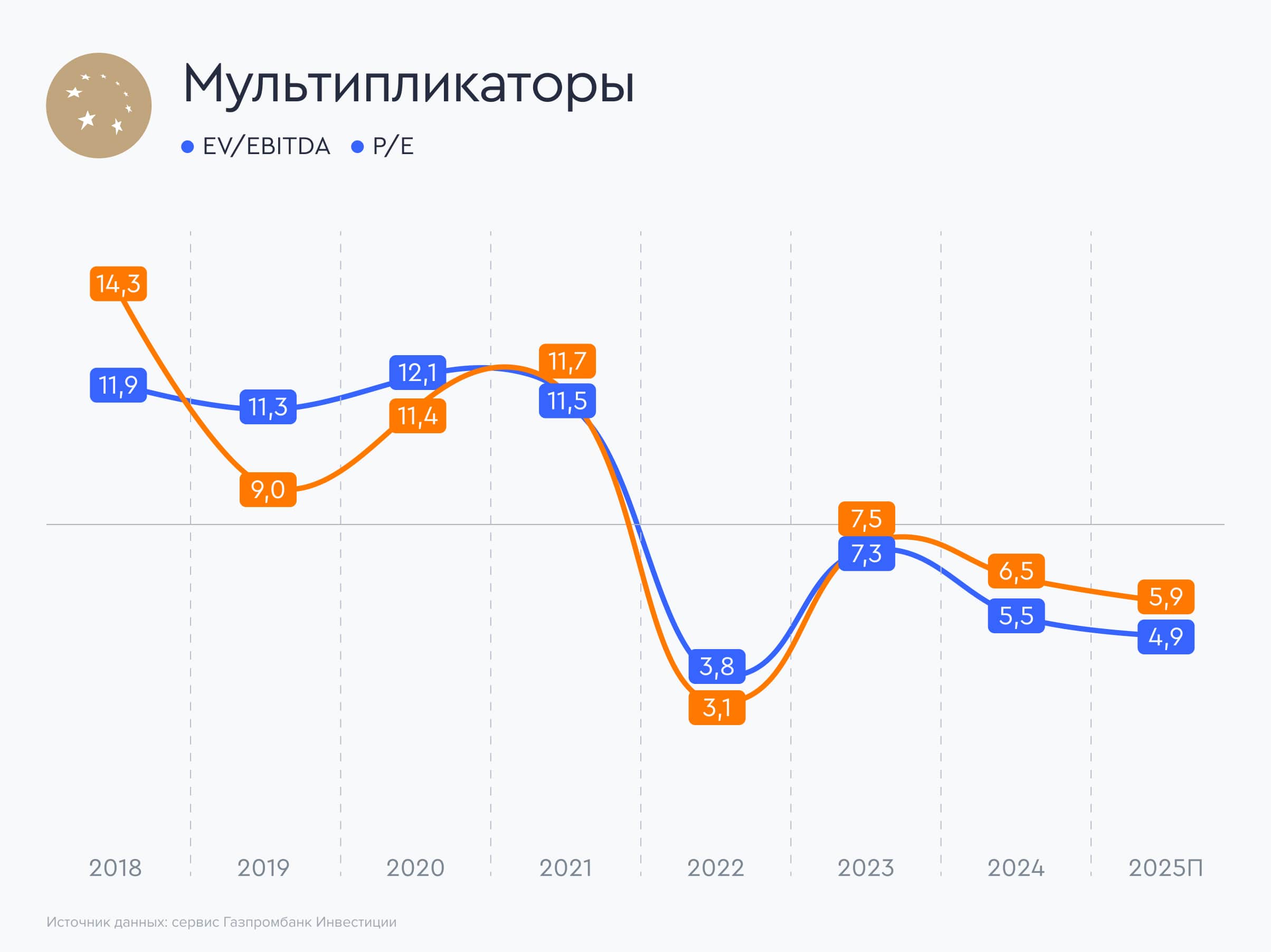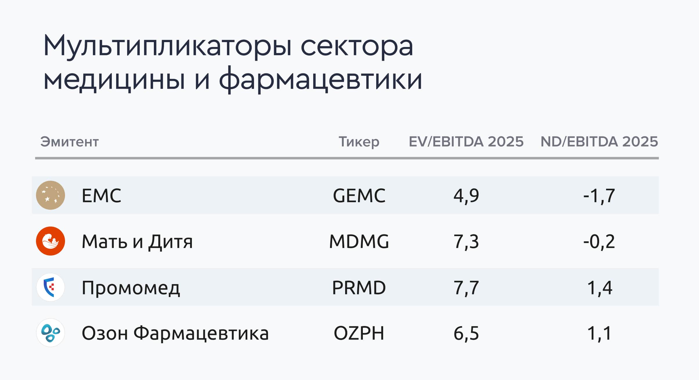 Акции ЕМС торгуются с наиболее низкими историческими мультипликаторами исходя из финансовых показателей 2025 года: P/E (отношение капитализации компании к ее чистой прибыли) ~5,9x, EV/EBITDA (соотношение капитализации компании с учетом чистого долга к прибыли до уплаты налогов, процентов и амортизации) ~4,9x, а также ниже смежных по сектору компаний.