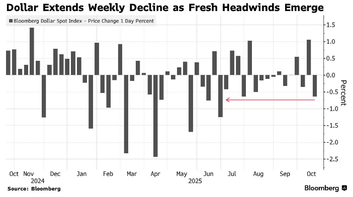 Индекс Bloomberg Dollar Spot за неделю упал на 0,5%, что стало худшим результатом с июля. Доходность двухлетних казначейских облигаций снизилась до шестинедельного минимума. Трейдеры повысили свои ожидания по смягчению денежно-кредитной политики ФРС, прогнозируя снижение процентной ставки на 53 базисных пункта к концу года, что больше, чем 46 пунктов, которые ожидали в среду.
