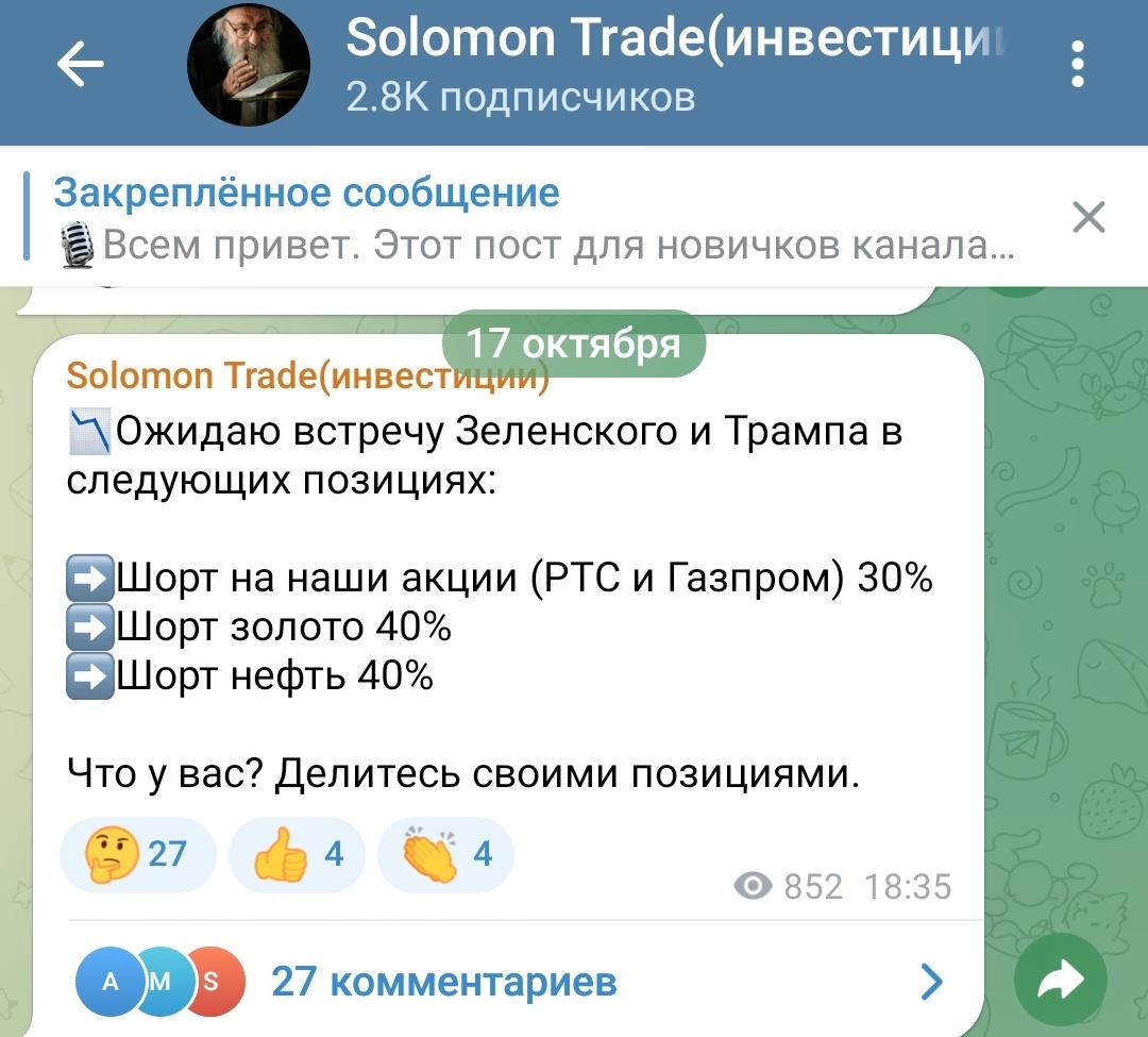 ➡️Несмотря на то, что я не особо верю в успех переговоров, я отдаю себе отчёт в том, что наш рынок в моменте спокойно может улететь вверх ещё на процентов десять, только на этом локальном позитиве. Такое уже было пару раз, и ничего не мешает повториться этому вновь. Поэтому решил перестраховаться.