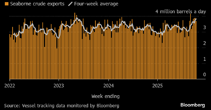 В последние четыре недели из российских портов в среднем выходили 35 загруженных нефтетанкеров в неделю. Это всего на одно судно меньше, чем в начале 2022 года (до СВО), когда Bloomberg начал вести подобную статистику.