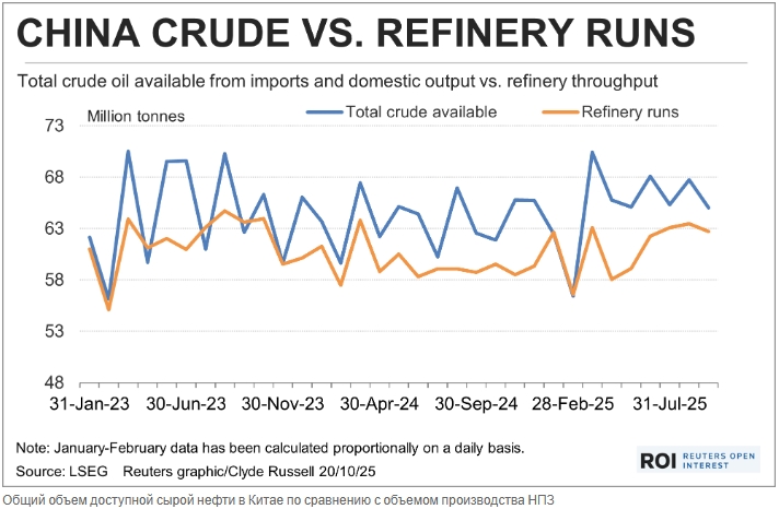В сентябре запасы сырой нефти в Китае существенно сократились из-за уменьшения импорта и увеличения переработки на нефтеперерабатывающих заводах, что привело к снижению доступных для хранения излишков.