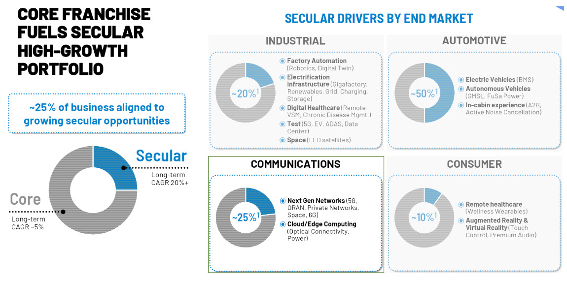 В коммуникационном блоке Analog Devices выделяются два ключевых направления — сети нового поколения и облачные или периферийные вычисления. Первое связано с развитием операторских и частных сетей, второе с оптической связью и электропитанием в ЦОД. График выше иллюстрирует, что значительная часть продуктового портфеля компании изначально ориентирована на долгосрочный, устойчивый спрос, а не на краткосрочные циклические подъемы.
