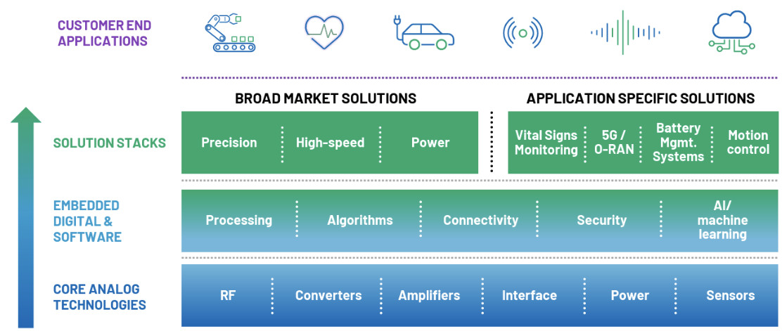 На схеме ниже видно, что BMS относится к прикладным решениям, которые созданы на основе базовых аналоговых технологий и встроенного программного обеспечения. Это означает, что ADI продает не отдельную микросхему, а целый функциональный комплекс, который сложнее заменить продуктом конкурента и который увеличивает стоимость компонентов компании в каждом устройстве.