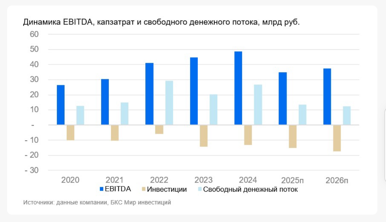 Высокая прибыль. Индексация цен на газ с 1 июля 2025 г. и ожидаемая индексация тарифов на мощность должны двигать вверх выручку Юнипро. Компания также реализует программу модернизации тепловых электростанций. Действующее регулирование позволяет Юнипро генерировать прибыль благодаря эффективным электростанциям и относительно низким затратам. Ранее, когда Юнипро раскрывала детали финансовых показателей, мы видели, что рост капзатрат оставался ниже операционного денежного потока. Это позволяло компании получать значительный свободный денежный поток.