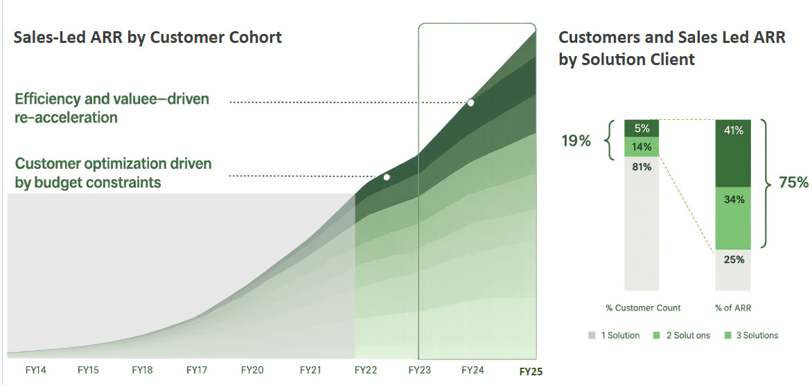 - Хорошо прогнозируемый рост: коэффициент удержания чистой выручки (NRR) составляет около 112%, более 1,5 тыс. клиентов с годовой стоимостью контракта (ACV) свыше $100 тыс., а также рост клиентских групп, привлеченных в 2021–2025 финансовых годах.