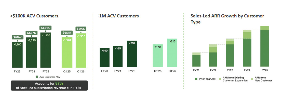 Экономические показатели это подтверждают. В 1-м квартале 2026 финансового года руководство отчиталось о коэффициенте удержания чистой выручки (NRR) на уровне около 112% и о более чем 1 550 клиентах с годовой стоимостью контракта (ACV) свыше $100 тыс. Это означает, что доходы от расширения услуг для существующих клиентов превышают потери от ухода других клиентов, а переход на более дорогие тарифные планы работает эффективно. Число клиентов с ACV свыше $1 млн продолжает расти, а в 2025 финансовом году на клиентов с контрактами от $100 тыс. пришлось 87% выручки от подписок, оформленных через отдел продаж. Бессерверная модель и новые ИИ-модули служат катализаторами как для расширения существующих контрактов, так и для привлечения новых клиентов.