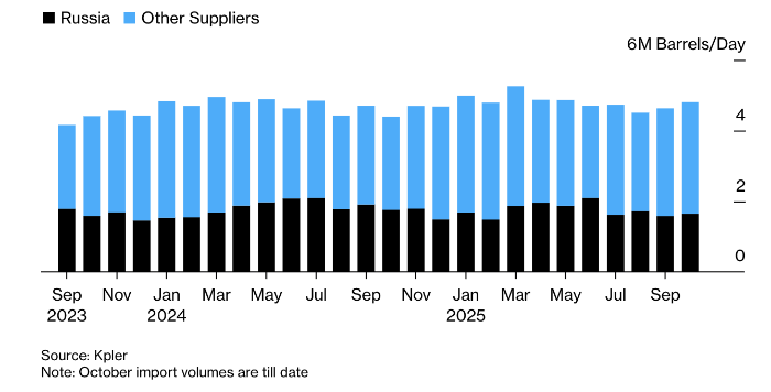 Индия избегает сырья из Ирана и Венесуэлы, находящегося под санкциями США, однако российские грузы оставались разрешенной «сделкой со скидкой», и закупки резко выросли — часто за счет традиционных поставщиков, таких как Саудовская Аравия, Ирак и Нигерия. По данным аналитической компании Kpler, с начала этого года на Россию пришлось чуть более 36% индийского импорта нефти. Этот факт раздражал президента Дональда Трампа и стал препятствием в торговых переговорах после введения американских тарифов в августе.