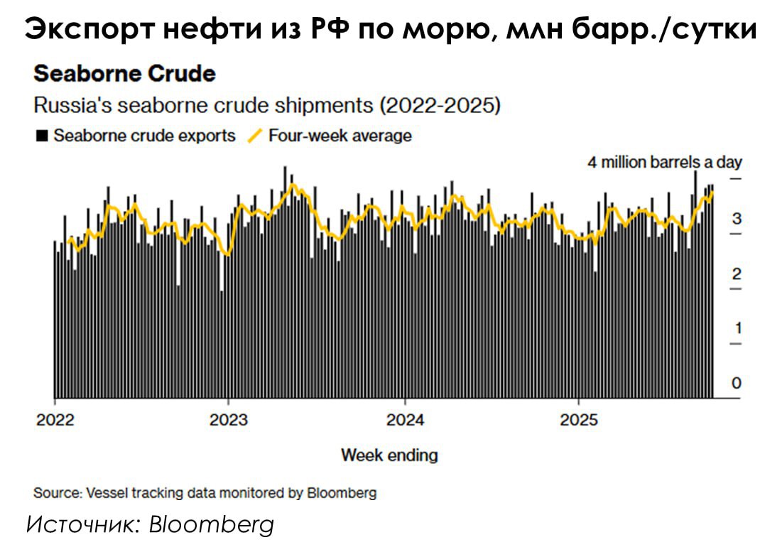 По данным Bloomberg, несмотря на пошлины Дональда Трампа, общий объем экспорта нефти из РФ по морю вырос с 3,2 млн барр./сутки (мбс) в августе до 3,65 мбс в сентябре. В первой половине октября средний показатель оставался на уровне сентября.