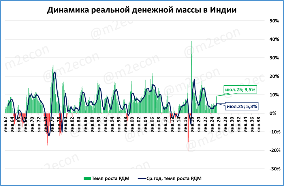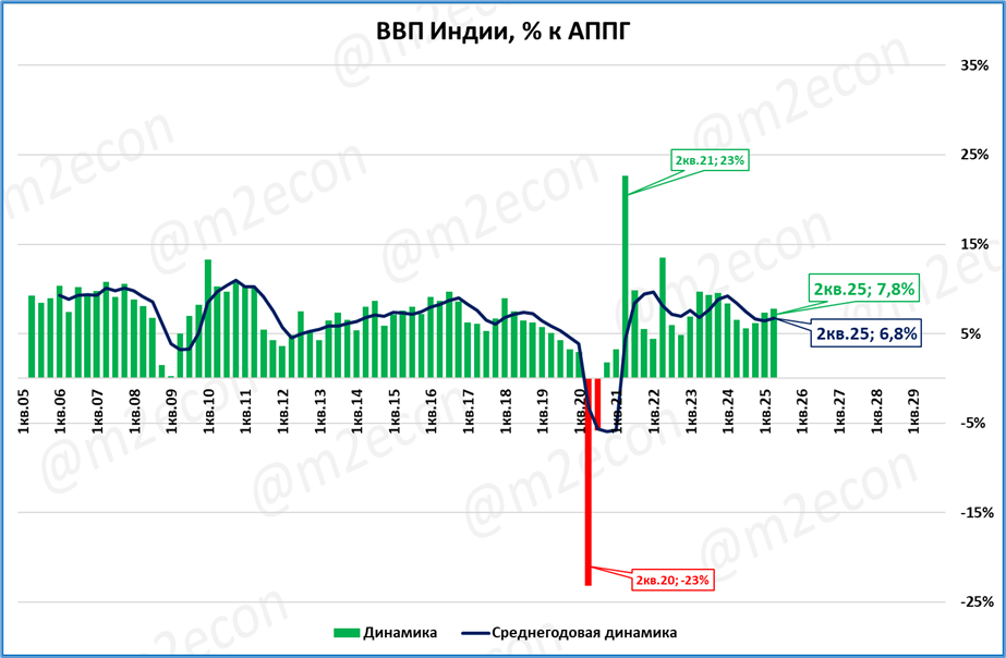Индия, рост РДМ составил 9,5% к аналогичному периоду 2024 года. ВВП во 2 квартале вырос на 7,8 %. МВФ прогнозирует рост в 6,6%